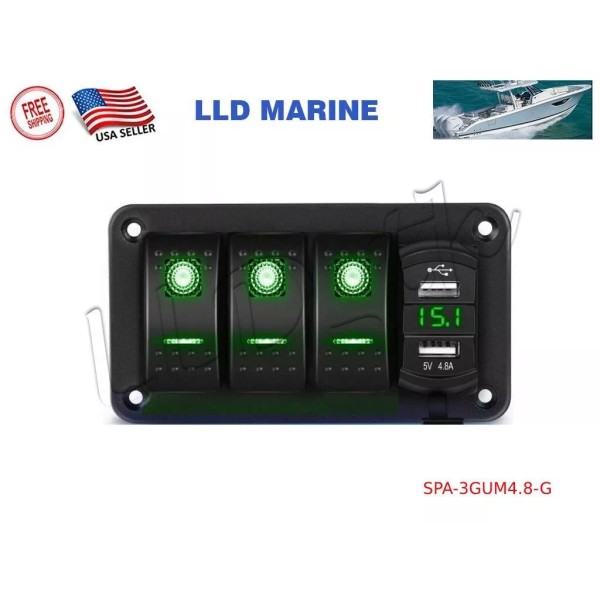 LLD_TK 3 Gang Toggle Rocker Green LED Switch Panel USB 4.8A ATV Boat Marine RV Truck