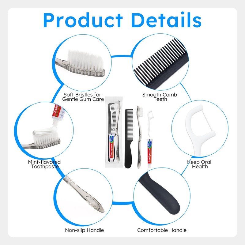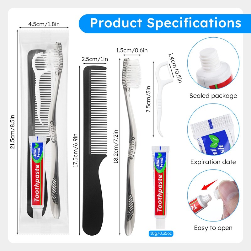 - Brand: LLHQAMT. Wide Application: Our toothbrush and toothpaste set is ideal for travel use. Each package is individually packaged, containing a toothbrush, toothpaste, individually wrapped floss, and combs in bulk. It is very convenient to carry and meets your daily oral hygiene needs. You can carry it with you at hotels, airlines, business trips, home, office, and camping. The toothbrush and toothpaste set travel can also be donated to homeless shelters and other charitable organizations.