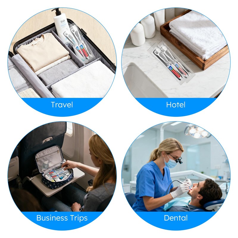 Our travel toothbrush set includes an 18 cm/7.1-inch toothbrush, 10g of premium toothpaste, 1 individually wrapped travel floss, and 1 black comb, all individually packaged. Not only does it offer a more premium feel, but it also ensures the cleanliness and tidiness of the hotel toothbrush kit. This makes using the travel toothbrush set with toothpaste safer and more reassuring. The 10g premium toothpaste included in the travel toothbrush and toothpaste set not only helps clean the toothbrush more effectively, leaving a lasting fresh scent and protecting your teeth, but also makes it more convenient to use. You can carry it with you at all times. The travel-sized toothbrush is ideal for travel, hotels, airlines, homes, offices, and camping. Disposable toothbrushes with toothpaste can also be donated to homeless shelters and other charitable organizations.