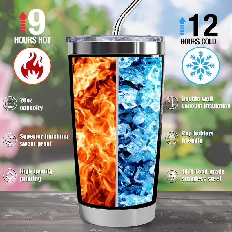 - 【SIZE】: A thermos cup with different patterns on both sides. This tumbler cup is 7 inches high and 3.5 inches wide, suitable for most car cup holders, and easy to hold and carry