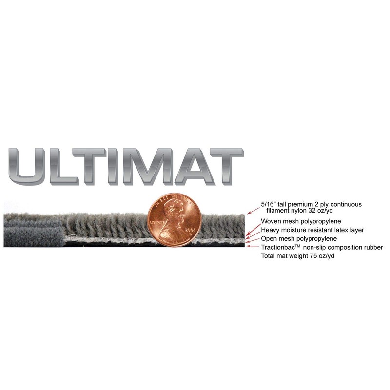 Ultimats material was originally designed for automotive use, with comfort, performance and durability in mind, and over 30 years later the Ultimat brand is still the top selling, custom fit logo mat in the automotive aftermarket. Ultimats feature a premium, continuous filament two-ply nylon yarn in a 32 ounce per yard construction. Twice the weight and density of original equipment mats, Ultimats dense construction and 5/16″ pile height provide impressive long wear and true comfort. Lloyd’s custom computer designed patterns are designed to provide greater coverage and protection than factory mats and a consistently precise fit from computer controlled cutting. The durability of all Lloyd’s carpet mat products is enhanced by our unique multi-layer backing providing stiffness, moisture resistance and anti-skid characteristics. All Lloyd Mats are equipped with factory compatible anchors, or Lloyd’s own, easy to install mat hooks. Ultimats custom fit mats offer great style, function and wear. Features: 5/16″ pile height Woven Mesh Polypropylene Heavy Moisture Resistant latex Layer Two-ply nylon yarn in a 32 ounce per yard construction Tractionbac Non-Slip Rubber