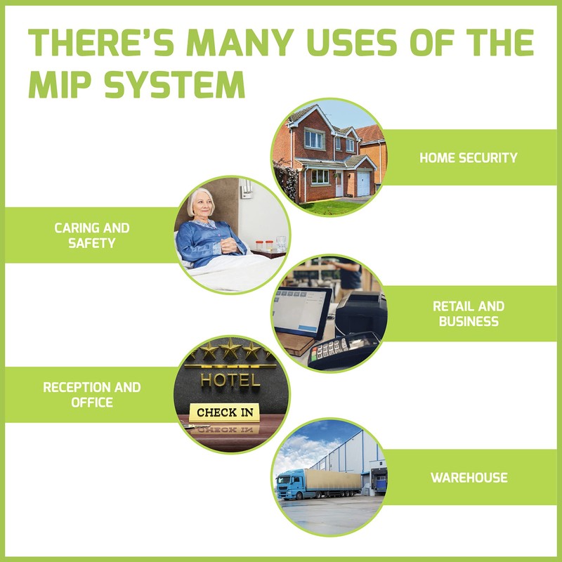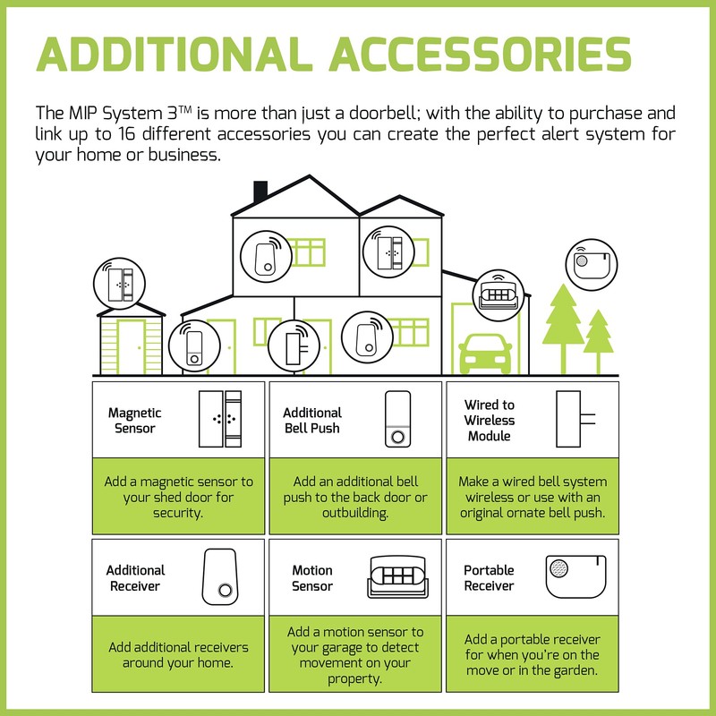 - LINK TO THE MIP SYSTEM: MIP System 3 is more than just a doorbell; with the ability to purchase and link up to 16 different accessories (bell push, chime receiver, magnetic sensor, PIR motion sensor, etc.) you can create the perfect alert system for your home or business. MIP System 3 allows you to choose different melodies for different transmitters with the flick of a switch.