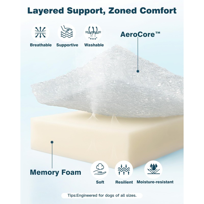 - Dual-Layer Comfort & Support: This orthopedic dog bed features dual-layer design: an air fiber layer for stable support and a memory foam layer for added comfort. Unlike single-layer beds, our dual layers provide superior support, comfort, and durability, perfectly protecting your pet’s joints.