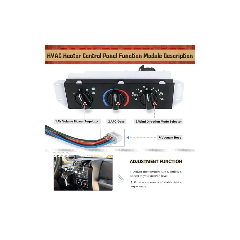 - Application: For Jeep Wrangler / TJ 1999-2001; For Jeep Wrangler / TJ 2002-2004 (Right Hand Drive) --- It fit the models with Air Conditioning