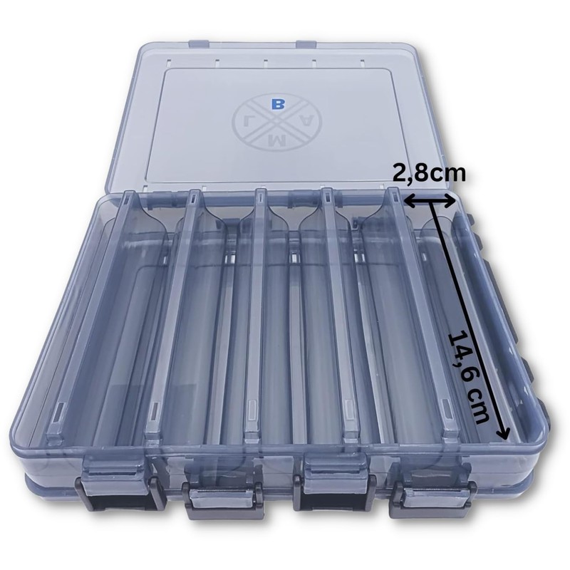 With the LMAB tackle box hardbait measuring 20.5 x 17 x 4.8 cm, there is the perfect box for slim hardbaits such as twitchbaits, topwaterbaits, but also for small crankbaits. A total of 10 compartments are distributed on 2 sides and offer plenty of storage space in the double-sided tackle box. As it is made of smoky grey plastic, it is slightly transparent and thus offers an immediate overview of the contents even when closed. To preserve the colours of the precious hardbaits, the material is UV-repellent. In addition, the box has ventilation slots, which ensure good air circulation and thus protect the hooks from rust.