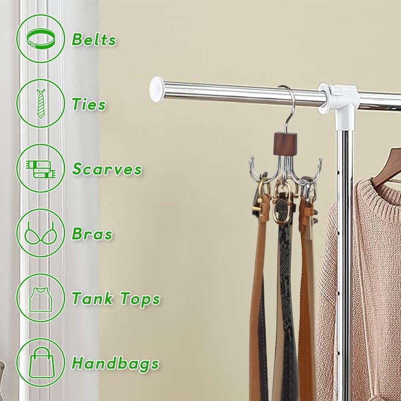 LMSAWK 4 Pieces 360 Degree Rotating Metal Belt Holder, Wooden Belt Hanger, Space Saving Belt Holder for Socks, Belts, Gloves, 6 Hooks, Wood Colour