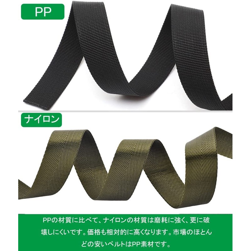 - Product Specifications: Belt Length: Approx. 6.6 ft (2 m) per piece. Band width: about 25mm Material: Nylon Breaking Strength: 250kg Working load: 100kg Color: Duck Green Set Contents: 6.6 ft (2 m) x 4