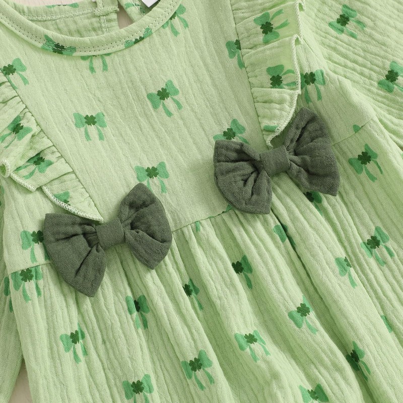 - Features: Spring clothes for baby girls, green color design, letter or lucky shamrock full printed, long sleeve round neck clover bow printed jumpsuit with bow embellish, long sleeve one-piece outfit, crotch and buckle design, easy to put on and take off, super cute