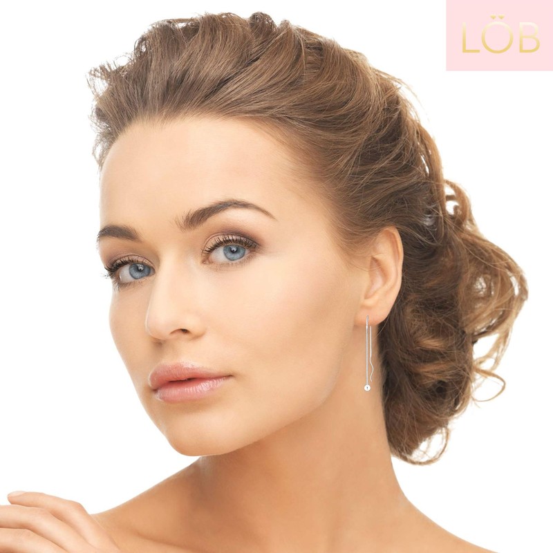 - LÖB GEO Collection, we love geometric shapes. You will receive a pair of modern long silver earrings for pull-through with chains and balls from the brand LÖB. Minimalist delicate earrings in geometric shapes. Filigree, delicate, minimalist, modern and elegant. Hanging sterling silver earrings with studs, silver beads and 925 silver stamp. Length: 92 mm. Ball: 4 mm. The piece of jewellery comes in an attractive gift box from LÖB.