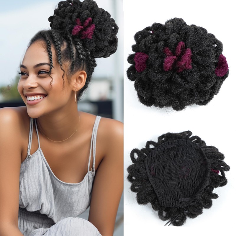 Loc Ponytail for Black Women Loc Petal Bun Loc Buns for Black Women Loc Bun Drawstring Ponytail for Black Women (8", 1B/Purple)
