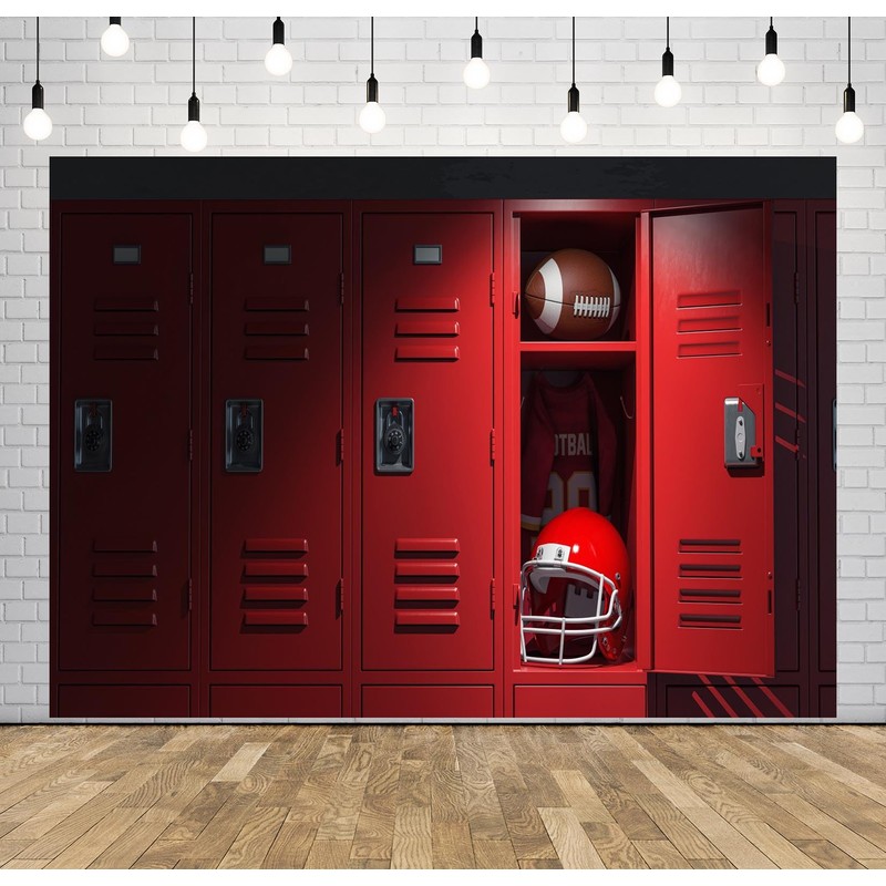 Loccor 5x3ft Fabric Red Locker Room Backdrop American Football Locker Room with Equipment,Ball and Helmet Background Sports Gym School Locker Room Backdrop for Class Photoshoot Props