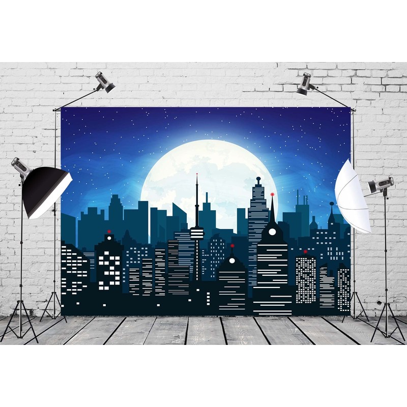 Loccor 5x3ft Fabric Super City Backdrop Superhero Backdrop Super City Night Scene Big Full Moon Starry Sky Superhero Theme Birthday Background Newborn Baby Shower Decoration Photoshoot Props
