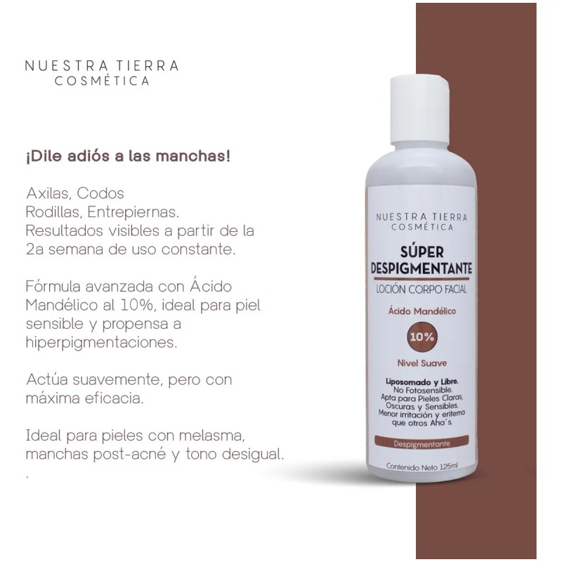 - Incluye: 1 Loción Súper Despigmentante con Ac. Mandélico al 10% de 125ml 1 Genitals (Crema Despigmentante para zonas íntimas) de 100ml Regalos: 1 Sun Care para piel sensible de 20ml (protector solar) 1 Deo White Toque Seco Desnudo de 17grs (desodorante sólido) ¡Despídete de las manchas y dale la bienvenida a una piel suave y radiante con nuestra Loción Súper Despigmentante! Transforma tu rutina nocturna y descubre el poder del ÁCIDO MANDÉLICO. Esta loción ayuda a despigmentar la piel, aclara las manchas de acné, paño y pecas producidas por el sol, corrige tonos desiguales de la piel, optimiza el recambio celular, hidrata, mejora el tono y textura de la piel, minimiza arrugas finas y estimula la renovación celular. Esta elaborada con ÁCIDO MANDELICO AL 10%, un ácido derivado de las almendras amargas, el cual es ideal para pieles sensibles, debido a que se absorbe más lentamente en la piel por ser una molécula más grande. El ácido mandélico posee acción hidratante, aclarante, antibacteriana y fungicida, es ideal para: