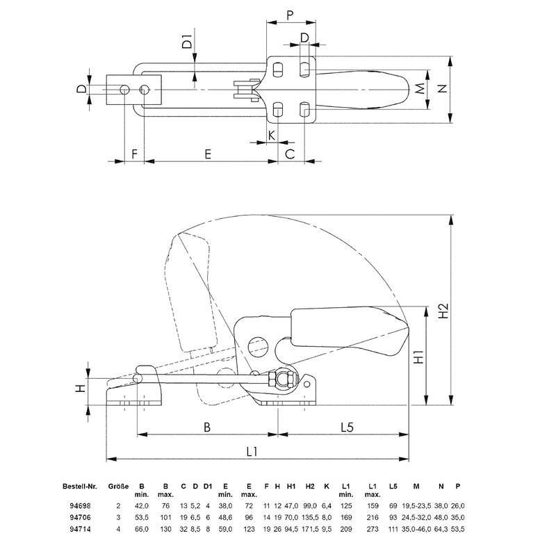 Lock Release Horizontal; Galvanised and Passivated and Einsatzgehärtete Non Rust Rivet LAGERBUCHSEN, Hook Hardened and Tempered. Be Gefettet (Size: 2; arm Length 38 to 72 mm) with ARRESTOR