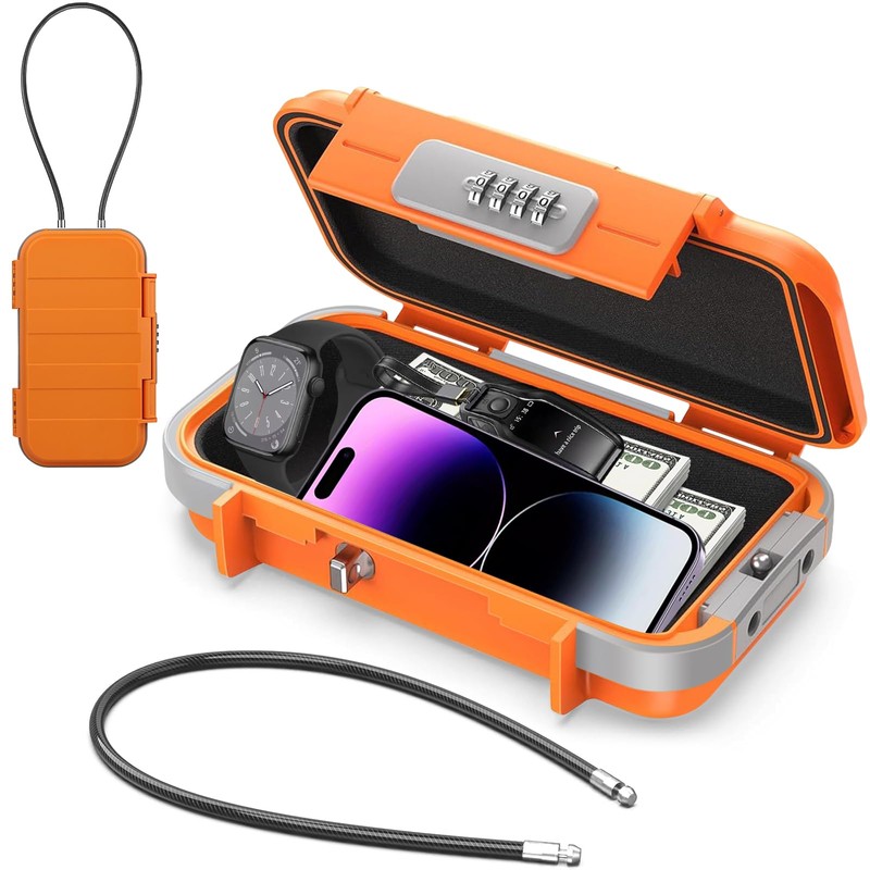 Lock Safe Waterproof, 4 Digit Combination Code, Portable Security Box with 6 mm Thick Removable Wire Rope, Secures Valuables when Travel, Beach, Camping, Office, Cars - Orange