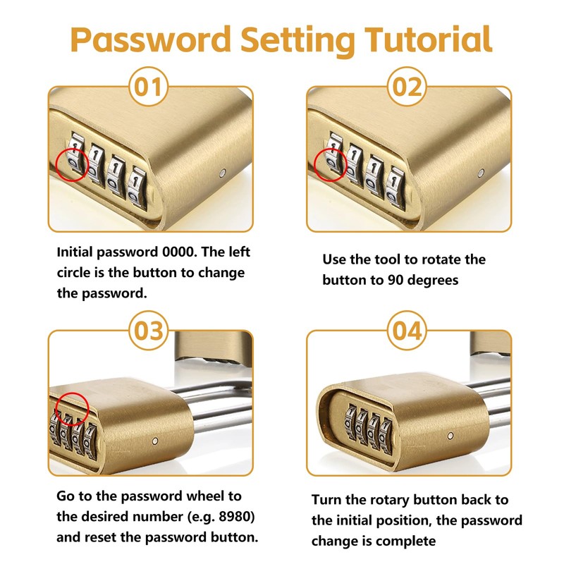 - Hidden password: the four-digit code is located at the bottom of the lock, it is hidden, waterproof and dustproof effect is better. The original password of the lock is 0-0-0-0.