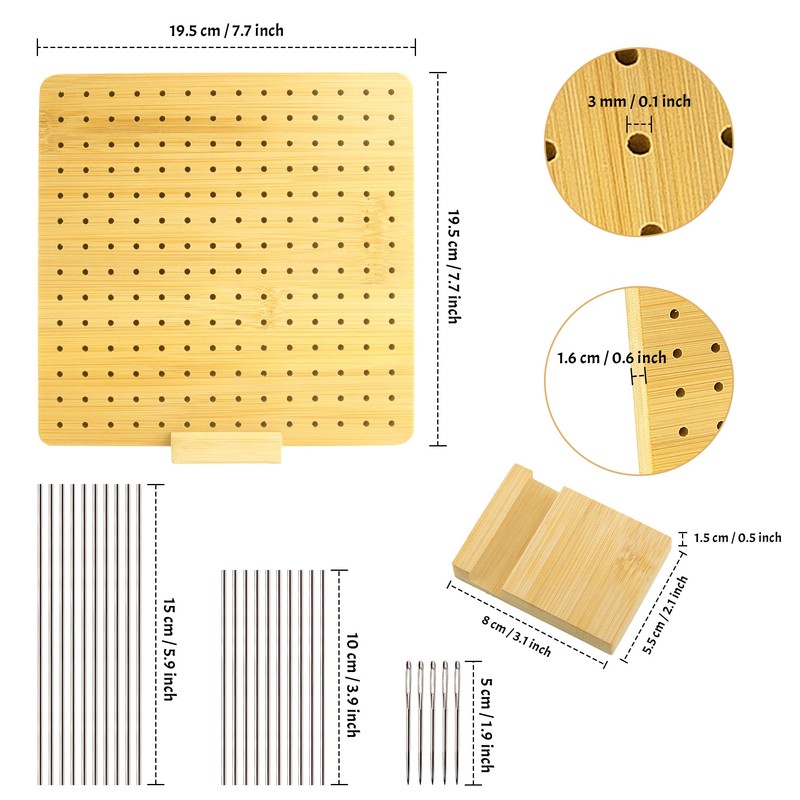 - BLOCKING BOARD PERFECT FOR BEGINNERS The size of the needle block board is 7.7 inches and the thickness is 0.6 inches. There are 14 holes with a diameter of 3mm per row, 196 holes in total, which makes it easy to measure and align your work as a craft beginner. Our knitted panels come with 20 stainless steel pins, which consist of long 10 6 inch needles and short 10 pieces 3.9 inch needles, you can hold more different shapes of granny square.