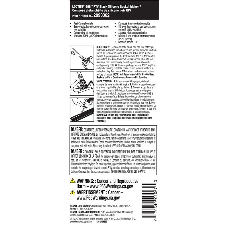 Loctite 598 RTV High Performance Silicone, Black, 190 ml -2093362