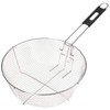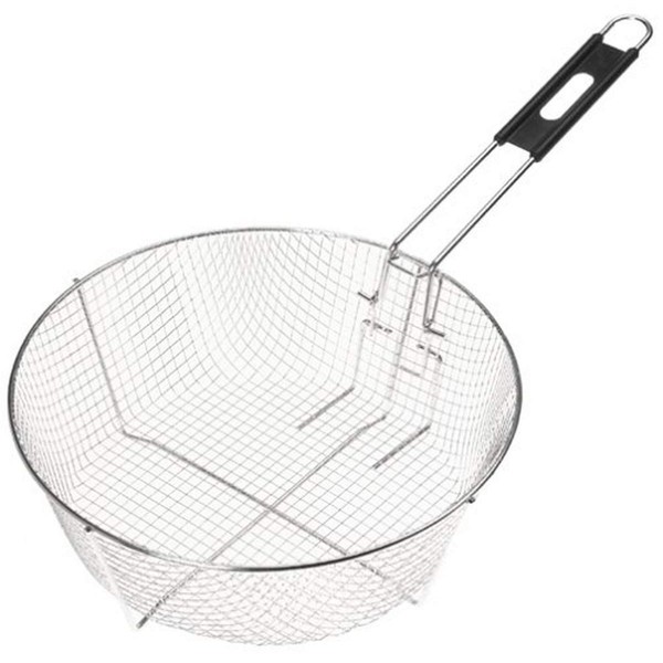 Lots of chicken, fries, and other foods fit inside this big deep-frying basket. It's 11-1/2 inches in diameter and 4-1/2 inches high, so it needs to be used with a large pot or pan. Made of stainless steel, the basket has a plastic stay-cool handle that locks safely in place during use and then folds inside the basket for compact storage. There's a hook for holding the basket securely on a pan edge during draining. The basket is dishwasher-safe. _\--Fred Brack_