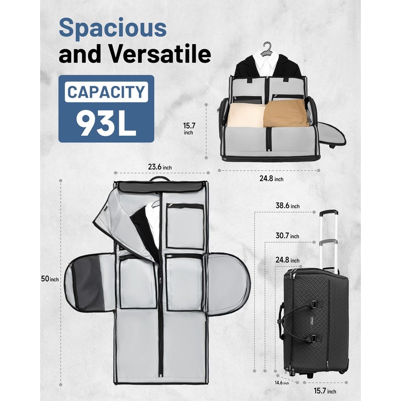 - 👜✨Super Spacious Design--With an impressive 93L capacity, the thoughtfully designed garment compartment offers ample room for suits, dresses, and other wrinkle-free essentials. Stability during transport is ensured, while the padded clothing area protects your garments. Multiple interior pockets provide easy access to accessories, shoes, and personal items, keeping you organized and ready for any occasion, be it a business meeting or a special event.