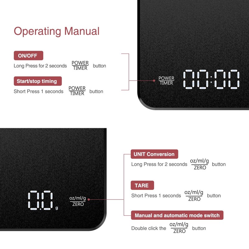 - 【LED Display & Touch Buttons】Adopt high-definition LED screen and high-sensitivity touch buttons, the pour-over coffee scale is elegant, convenient to operate, and can be easily read even in a dim or dazzling environment.