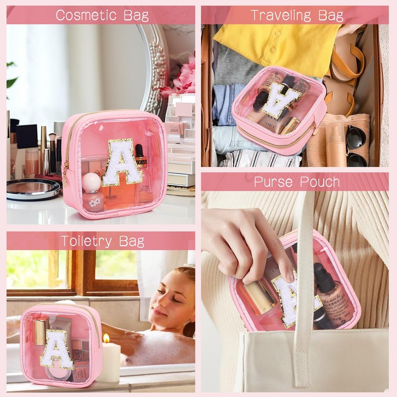 LOFOWN Initial Clear Makeup Bag Small Cosmetic Bag Travel Toiletry Bag Clear Zipper Pouch Purse Organizer Bags for Women, Pink, M, Initial Small Makeup Bag