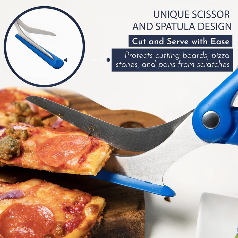 Loftern Blue Pizza Scissors - Non-Stick Pizza Scissors with Firm Grip Base - Food Grade Stainless Steel Pizza Cutter - 5-in-1 Food Slicer & Pizza Server - Durable, Safe & Mess Free