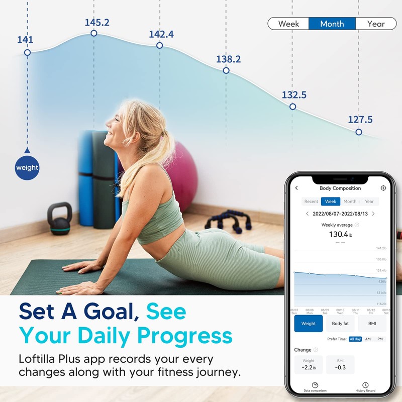 • Full Body Composition Analysis--Unlike the traditional weighing scale that only tells you weight results, LOFTILLA smart body composition scale provides you with another 13 measurements, including body fat%, muscle mass, BMI, and more. Enjoy your fitness journey and reach your goals faster!