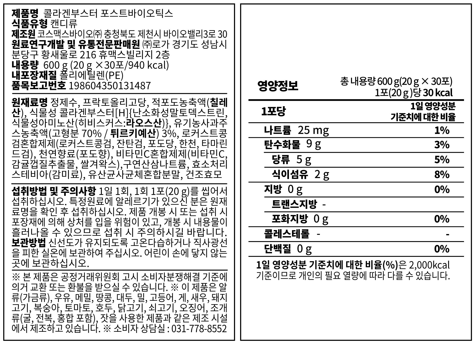 - Packaging Unit Contents (Weight), Quantity, Size: 20g x 30 packets (600g) *Per packet: Plant-Based Collagen Booster (H) 2,000 mg, Postbiotics Mixture 200 mg