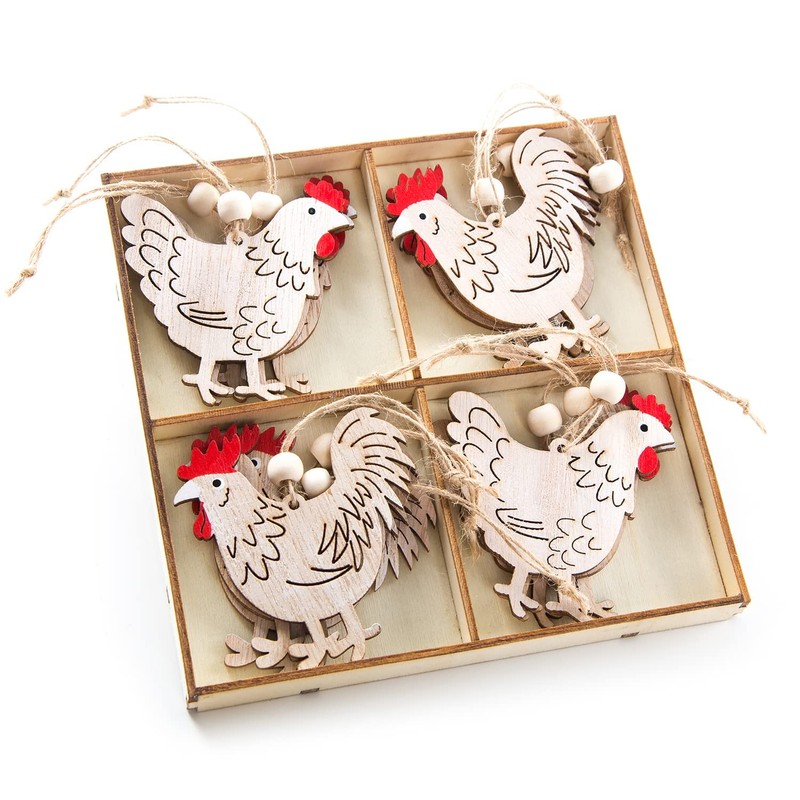 - Cute wooden chickens for hanging on the Easter shrub or for decoration as a small gift tag on Easter gifts.