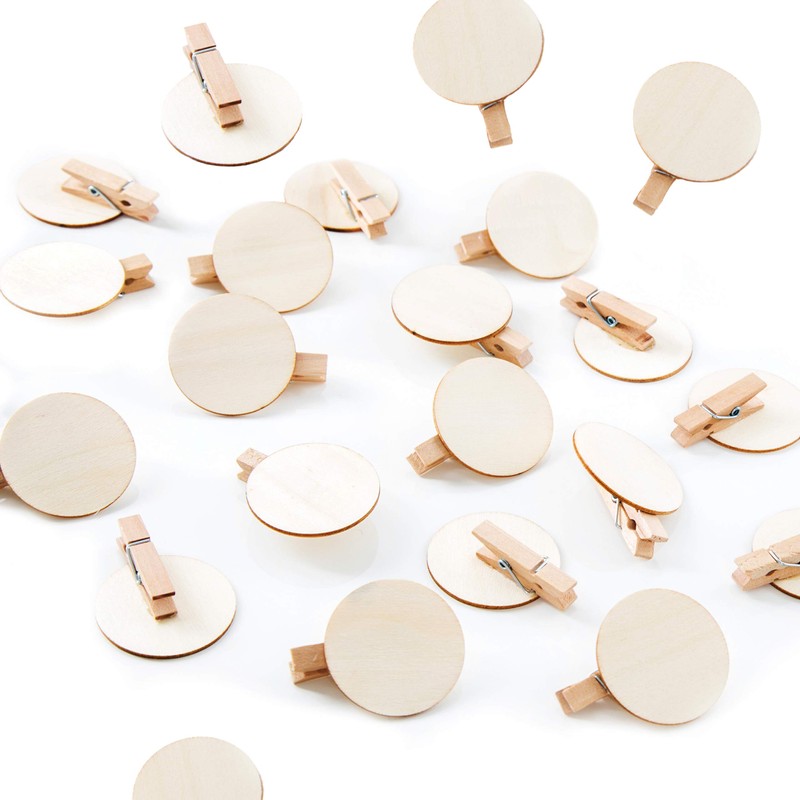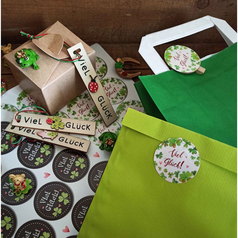 - Craft set consisting of 24 stickers in white with the lettering "Viel Glück" in green framed by small green clover leaves and red hearts + 24 wooden pegs in natural brown with a 4 cm wide wooden disc. The stickers also have a diameter of 4 cm and therefore fit perfectly on the wooden disc clips.