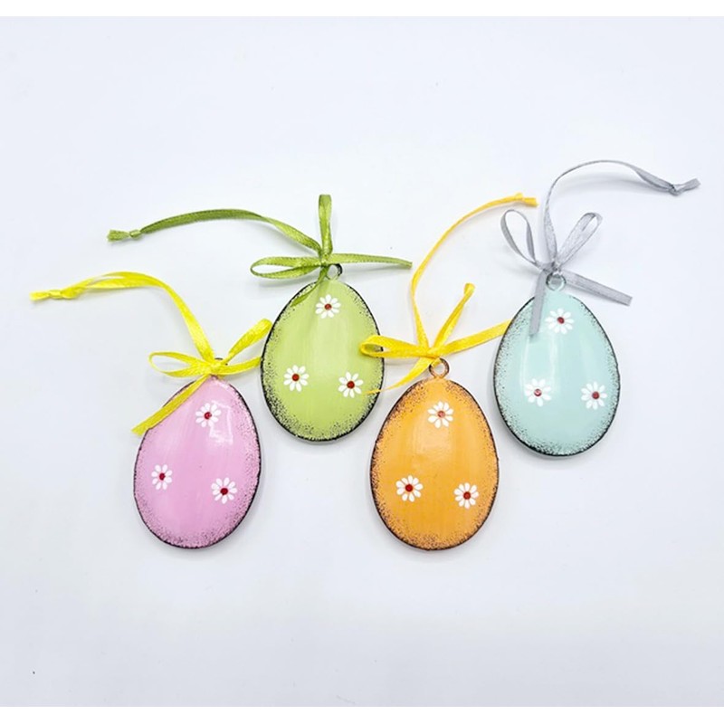 Diese bezaubernden Ostereier-Anhänger aus Metall verleihen Ihrer Osterdekoration einen charmanten, nostalgischen Touch. Das Set besteht aus vier handgefertigten Eiern in den frühlingsfrischen Farben Orange, Pink, Gelb und Mint, die jeweils mit zarten weißen Gänseblümchen verziert sind. Jedes Ei ist mit einer dekorativen Schleife und einer Aufhängeschnur versehen, die das Anbringen an Ostersträuchern, Zweigen oder in der Fensterdekoration ermöglicht. Die Metalleier haben eine leicht vintage-anmutende Optik durch ihre sanft schimmernde Oberfläche und die dezente Kantenverzierung. Diese vielseitigen Dekorationselemente eignen sich perfekt für die österliche Gestaltung von Innenräumen und geschützten Außenbereichen. Sie sind eine wunderbare Geschenkidee und lassen sich problemlos mit anderen Osterelementen kombinieren, um eine festliche Atmosphäre zu schaffen.