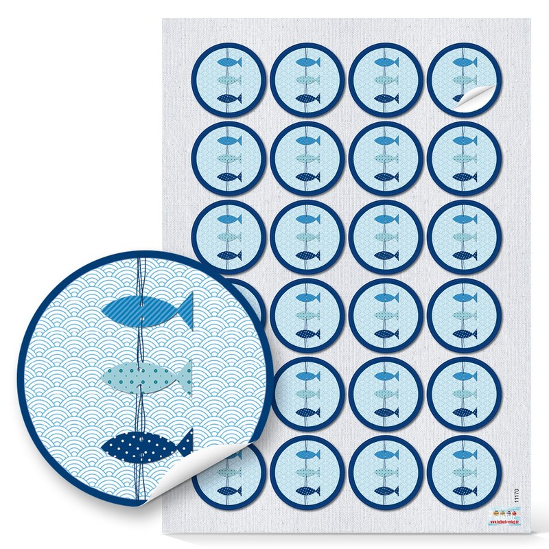 - Large sticker set consisting of a total of 120 maritime gift stickers. The set includes 24 shell stickers, 24 anchors, 24 fish stickers, 24 neutral stickers with nautical motifs (some for labelling) and 24 maritime sayings stickers.