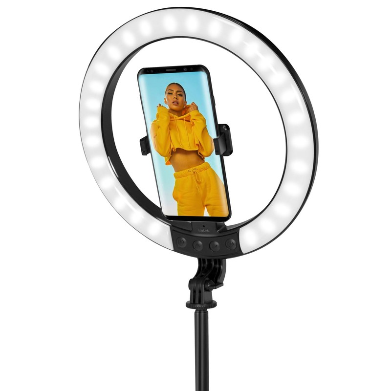 LogiLink AA0156 - LED Ring Light (Diameter 25 cm) with Smartphone Holder, 26 RGB Colour Modes and 95 LEDs for Professional Videos and Pictures, with Tripod + Remote Control