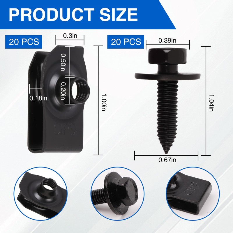 • Packaging Contents: You will receive 20 fender bolts and 20 U-nut clips. Bolt size: 1.04×0.67 in. U-nut size: 1×0.18 in. Great for replacing auto parts