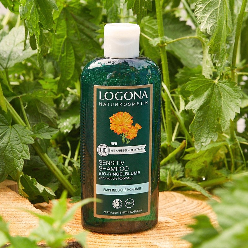 LOGONA Naturkosmetik Sensitive shampoo for naturally healthy hair, suitable for sensitive, sensitive scalp, mild hair shampoo with vegan formula from organic marigold, 1 x 250 ml