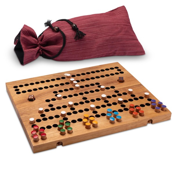- Exciting dice and strategy game for 2 to 6 players. Large, folding game board made of dark Samena wood with coloured game plugs. Decorative fabric bag with drawstring closure for storage. We only use wood from environmentally friendly plantation cultivation. Playing field: 26 x 33 x 2 cm (closed: 13 x 33 x 4 cm) weight: 720 g