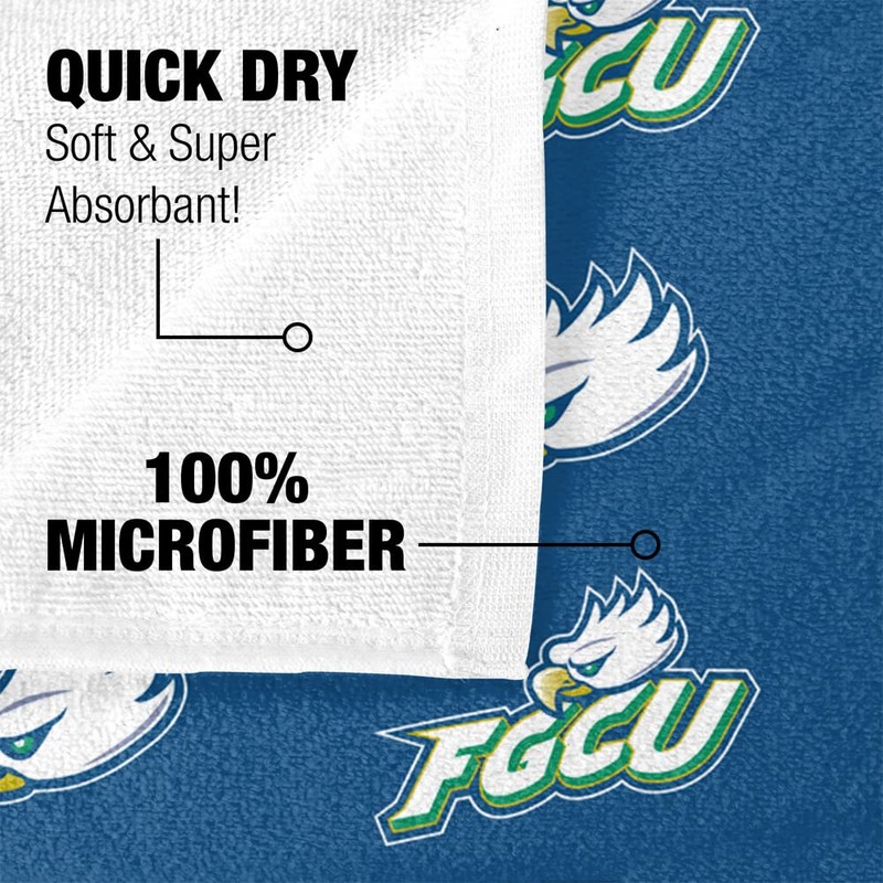 - FLORIDA GULF COAST UNIVERSITY LOGO PATTERN 30" x 60" BEACH TOWEL - This lightweight and compact beach towel is soft and comfortable, breathable, and durable. It is super absorbent to dry you quickly. The front features microfiber polyester for maximum color vibrancy and the back features cotton for maximum absorbency.