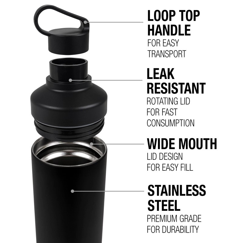 SWEATPROOF CONSTRUCTION: Fabricated from pro grade 18/8 powder-coated stainless steel, our sweat-proof canteen keeps condensation away. Refillable and reusable, our bottle features a 2-in-1 screw-top design. The wide mouth opening ensures easy filling, while the compact loop-top cap makes drinking a breeze.