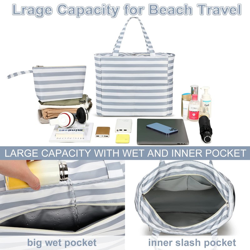 - 【Oversize Wet Zipper Compartment】Great Stripe tote bag for the pool/ beach Waterproof Sandproof with outside wet pocket keeping wet clothes separate from dry ones. Don't worry about other items in the mian compartment will get wet or meet sand.