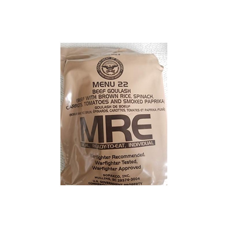 - Single meal 2022 Beef Goulash (new) Military issue MRE perfect for Hiking, Camping, and Emergencies Each package is factory sealed with Meal, Side dish, Dessert/Snack, Crackers or Bread or Peanut Butter, Powered Beverage, Utensils, Gum, Napkin, Towelette and Seasonings like Salt, Pepper and Sugar. Designed for maximum endurance and nutrition with average 1250 calories per meal. Ready to eat meal, and tested.10+ year shelf life. Great for hunting, long term survival, camping or food storage.