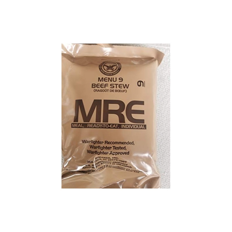 - Single meal 2022 Beef Stew Military issue MRE perfect for Hiking, Camping, and Emergencies Each package is factory sealed with Meal, Side dish, Dessert/Snack, Crackers or Bread or Peanut Butter, Powered Beverage, Utensils, Gum, Napkin, Towelette and Seasonings like Salt, Pepper and Sugar. Designed for maximum endurance and nutrition with average 1250 calories per meal. Ready to eat meal, and tested.10+ year shelf life. Great for hunting, long term survival, camping or food storage.