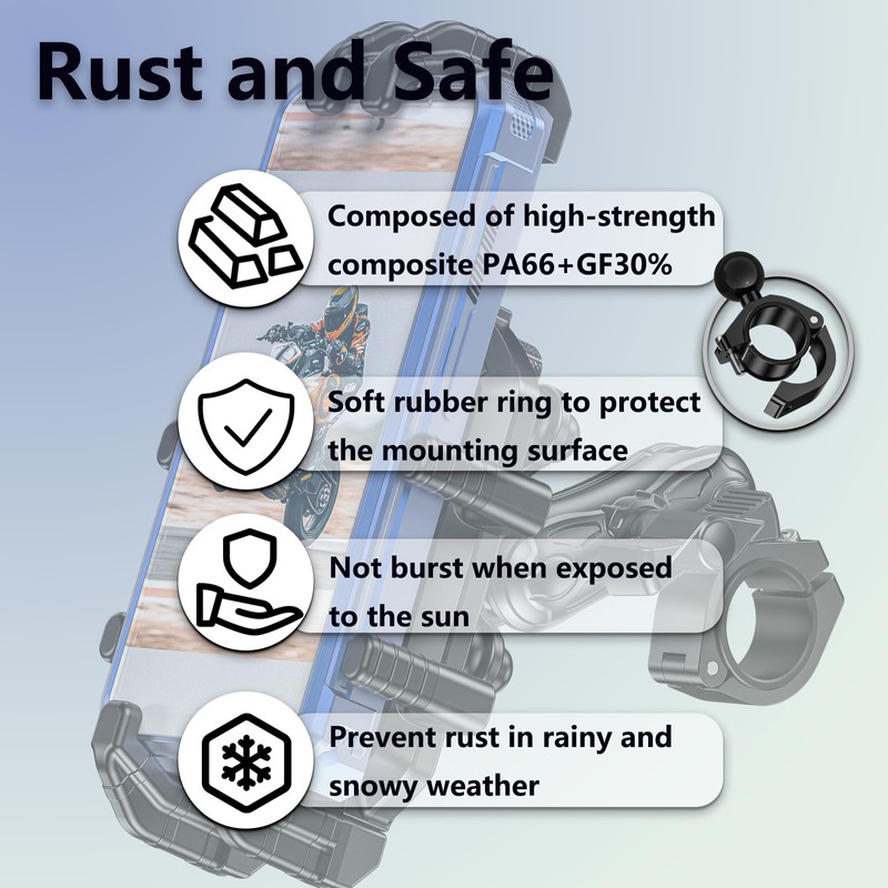 • 【Rust and Safe】 The main body of this motorcycle phone mount is composed of high-strength composite PA66+GF30%. It will not fade outdoors when exposed to the sun, and it will prevent rust in rainy and snowy weather, and will keep the texture as new for a long time.