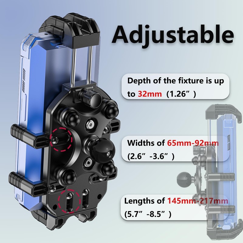 • 【Wide Compatibility】 Bike phone mount depth of the fixture is up to 32mm(1.26”), and it is paired with a thickened anti-slip pad. It is suitable for all smartphonne with lengths of 145mm-217mm(5.7”-8.5”), widths of 65mm-92mm(2.6”-3.6”), and thicknesses less than 32mm (with case). It is perfectly suitable for iPhone 15 Pro Max (wearing a thick anti-fall case), Samsung S23 Ultra, three-proof mobile phones (such as AGM, CAT) and other devices.