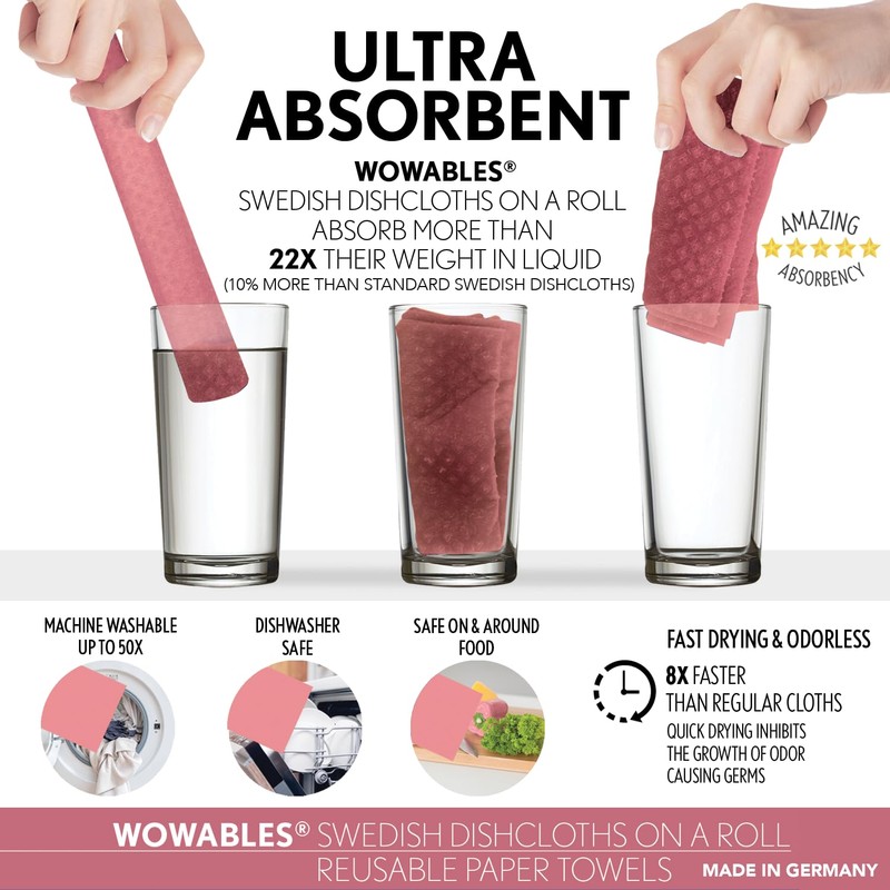 - ➤ Reusable & Sustainable - each Lola WOWABLES Swedish dish cloth sheet can be use to 120x - think about how many less disposable paper towels you will use plus wowables can replace sponges. Made of 70% Cellulose & 30% non-GMO Cotton. Our special design makes them "breatheable" alllowing for ultra-fast drying - never having an odor. Typical dish rags are not able dry off fast enough. On sustainability - our plant captures, cleans, and reuses its own water. And they fit on your standard paper towel holder.