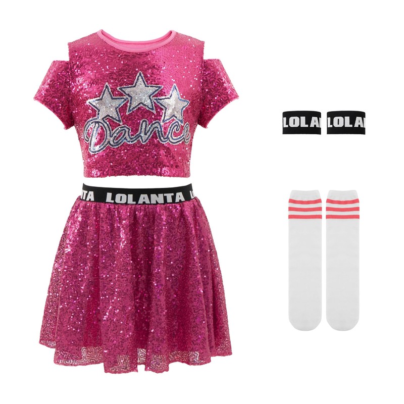 • PACKAGE INCLUDES: LOLANTA girl's dance outfit is a four-piece sequin dance set. 1x sequin crop top+1x sequin skirt+1 pair of matching socks+a pair of wristband.