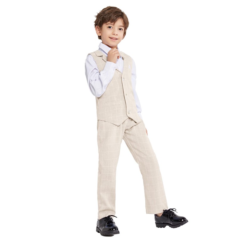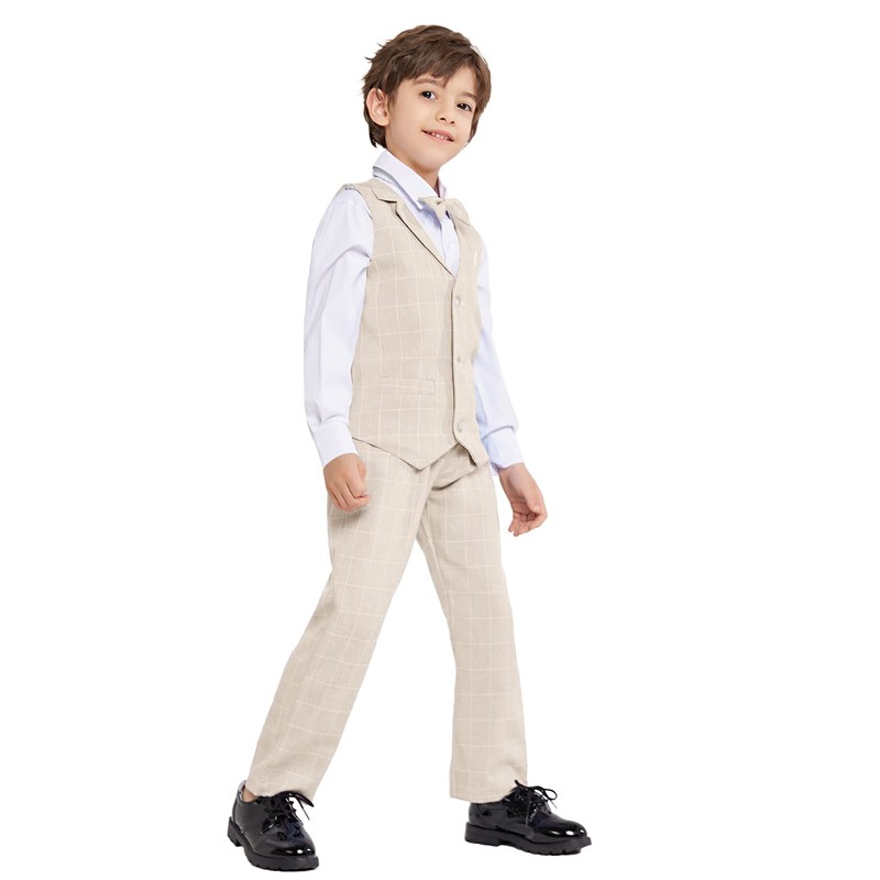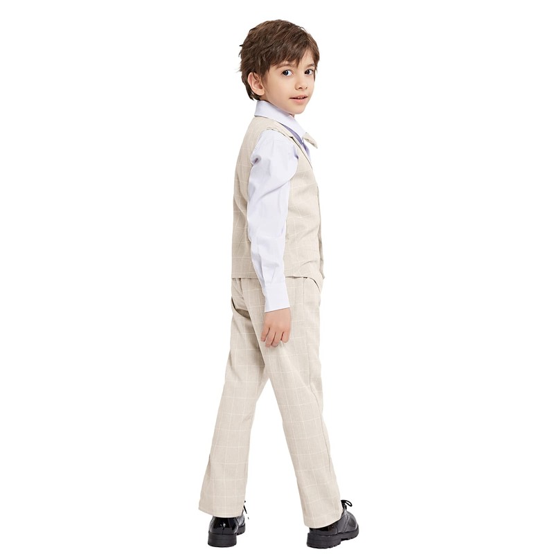LOLANTA 4-teiliges Jungen Karierten Anzug Set, Jungen Festival Smoking, Weste, Hemd, Hose und Fliege im Set(Beige, 4-5 Jahre,Tag 110)