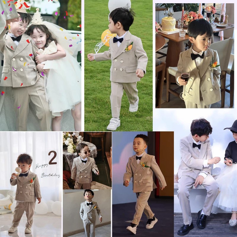 Lolanta little boys suit-perfect slim fitted, formal style with peaked lapels, V-neck, double-breasted. Shoulder padding and waistline enhance the suit's silhouette, elastic waist, cuffed trousers, more wear-resistant Beige/grey/balck tuxedo suit for boys from 2-9-year-old boys:wedding Parties,holiday parties,piano performance,award/graduation ceremonies,birthday parties, family gathering dinners and so on.