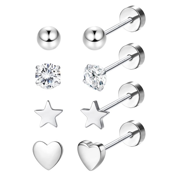 LOLIAS 4 Pairs Solid 925 Sterling Silver Stud Earrings Set for Women Men Tiny Small Ball Heart Star Cubic Zirconia Earrings Hypoallergenic Cartilage Helix Ear Piercing Earrings, Sterling Silver