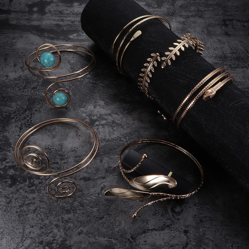 - ❃Cuff Bracelets for Women❃ One order includes 6 pcs different styles of upper arm bangles, leaf bracelet, feather arm cuff, filigree swirl arm bracelet, coil upper arm band, snake arm cuff bracelet, wire arm bracelet, minimalist style. Affordable cuff bracelets set, you are worth buying.